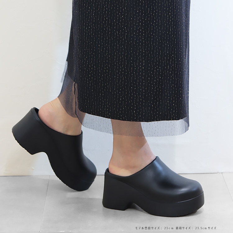 | コメント | サッと履けて軽量!丸みのあるフォルムに3cmのプラットフォーム、8cmのヒールアップで今っぽくおしゃれに履きこなせる一体成型のサボサンダルです。 濡れても汚れてもサッと拭き取るだけでOKなEVA素材でタウンユースはもちろん、レジャーやオフィス履きにもおすすめ。 適度な反発力のある厚底ソールと踵に配した硬めのパッドが足裏にかかる負担を和らげくれます。 ボリュームのあるフォルムながら片足216gと軽量で、甲をしっかりとホールドする木型を使用しているので長時間履いても疲れにくく快適な履き心地を実現。 夏は素足で冬は厚手のソックスを合わせて通年使えて活躍するトレンドのサボシューズは1足あると便利なアイテムです。 |