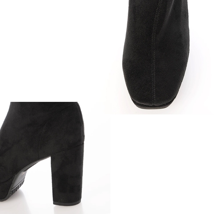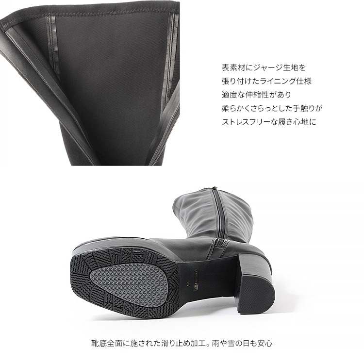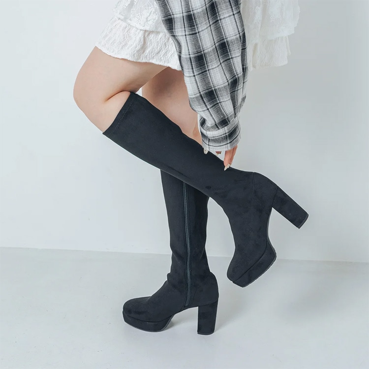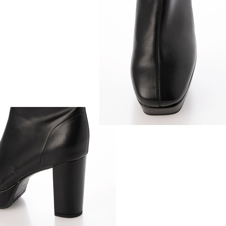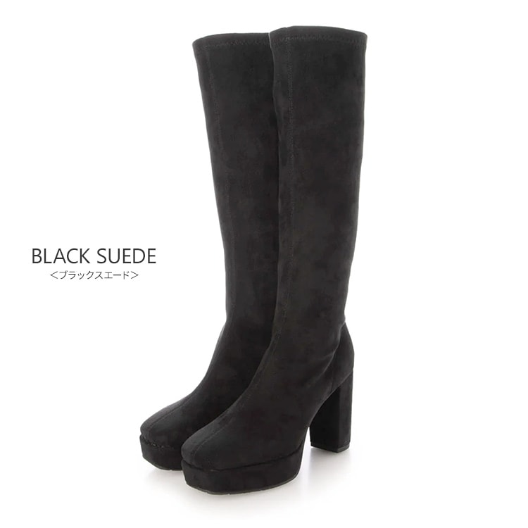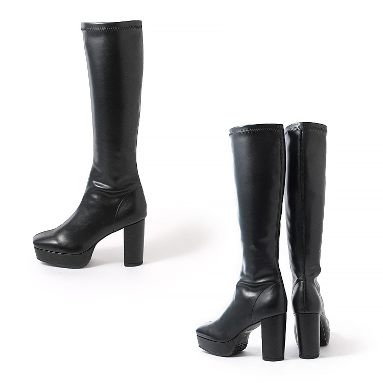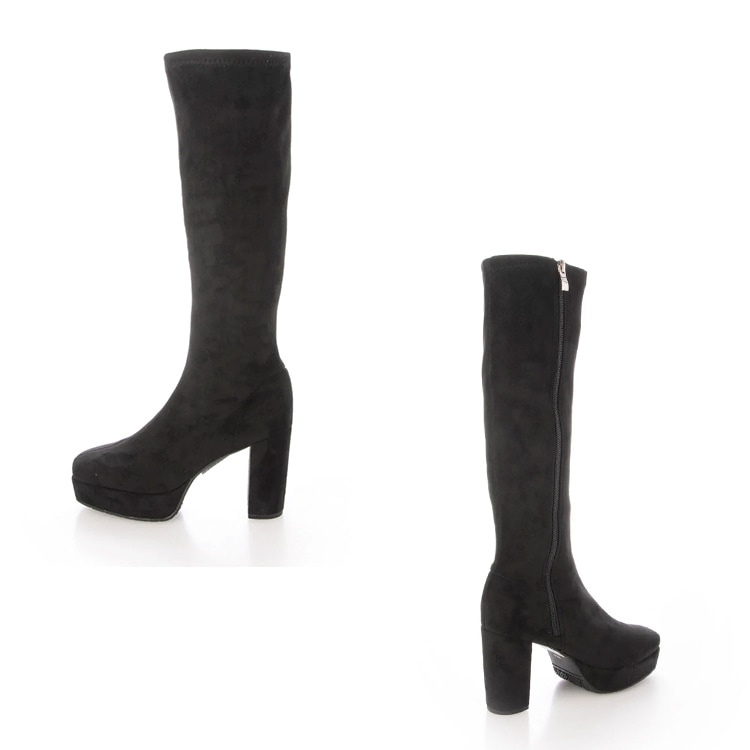 柔らかな素材感と適度な伸縮性で足にフィットし、 9.5cmのヒールに3cmのストームで美脚効果をも高めてくれるストレッチブーツ。 |