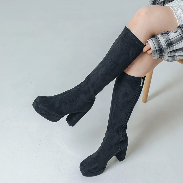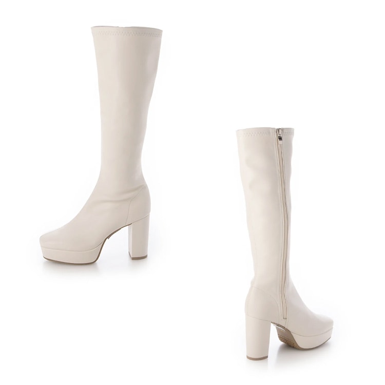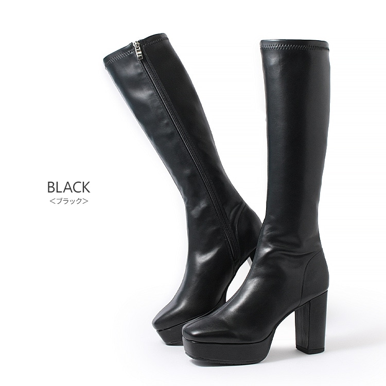 ロングブーツ 厚底ブーツ スクエアトゥ ハイヒール ヒール9cm チャンキーヒール ブラック アイボリー 5817