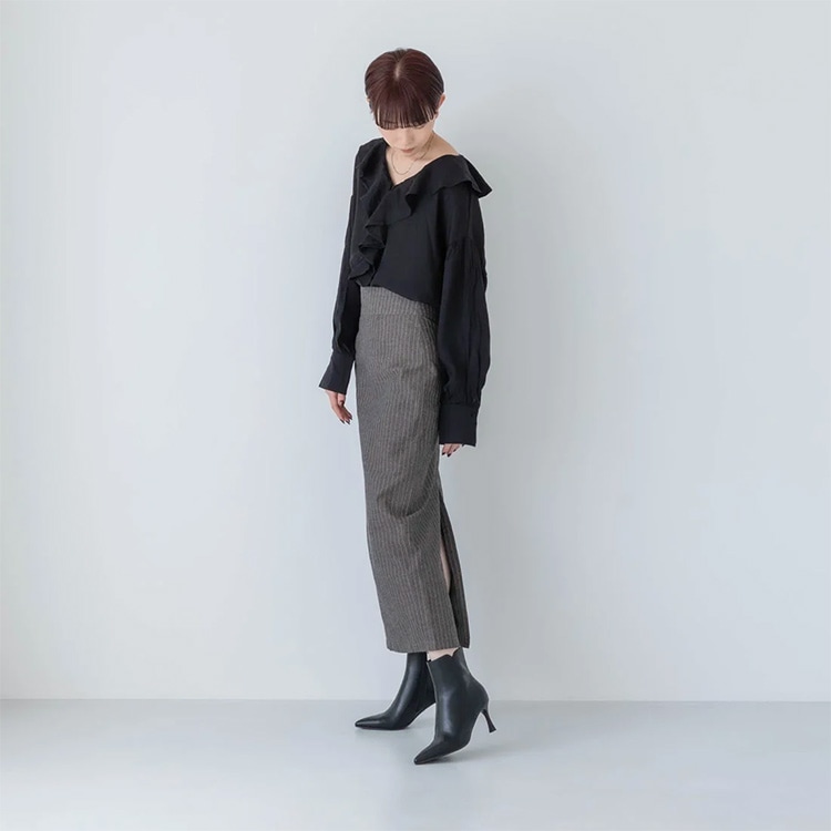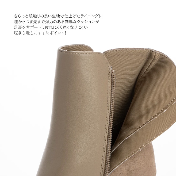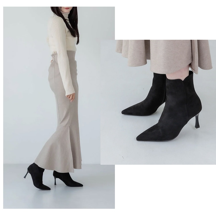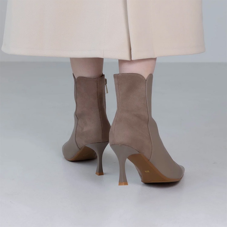 | コメント | 履き口のフラワーカットにヒール先に向けてやや広がるラインのフレアーヒールでシンプルながらさりげないデザイン性がポイントのきれいめショートブーツ。 ポインテッドトゥのシャープなつま先がすっきりした足元を演出し、脚長効果を高めてくれるデザイン。やや細身の筒周りが脚のラインを綺麗に見せて、履くだけで美脚へと導いてくれます。 7.5cmのフレアヒールは、着地面が広く見た目以上に安定感あり。 弾力のある肉厚なインソールクッションが足裏をサポートし疲れにくく痛くなりにくい仕様なのでヒール初心者さんでも安心の履き心地でおすすめです。 ※スムースとスエードの異素材切替えデザインはベージュコンビのみとなります。 |