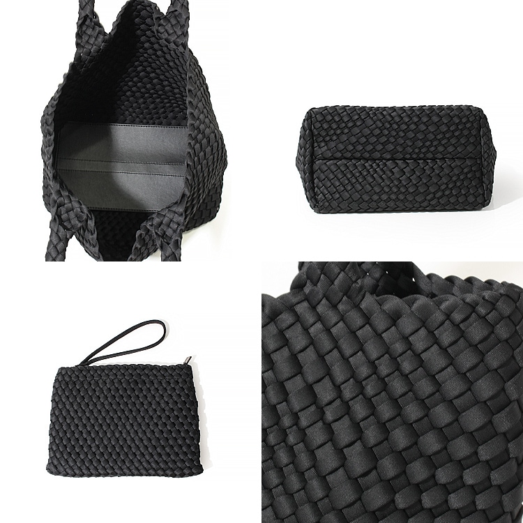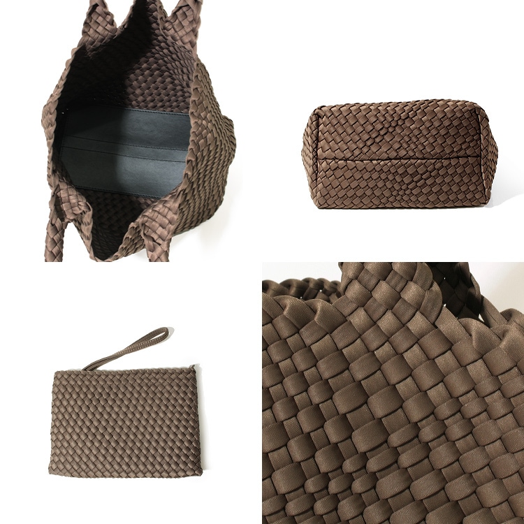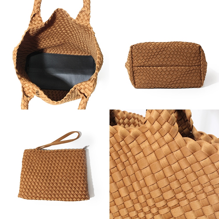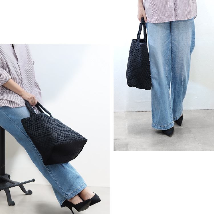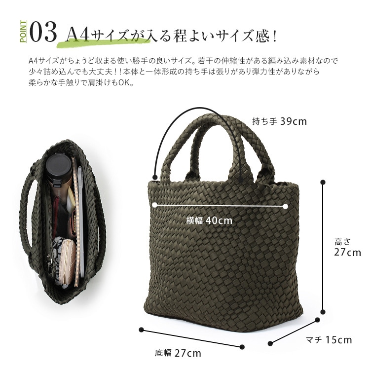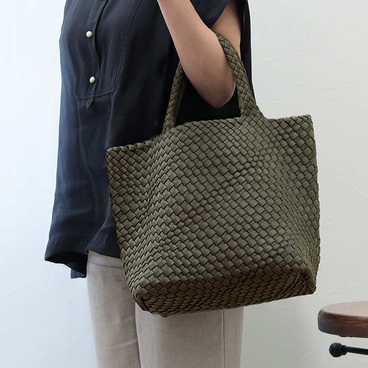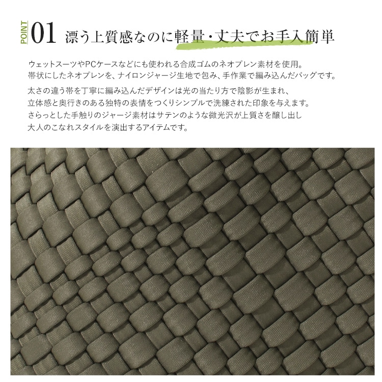 | コメント | 軽量で丈夫、お手入簡単で使い勝手抜群でデザイン性、機能性、耐久性を兼ね備えたバッグです。 ウェットスーツやPCケースなどにも使われる合成ゴム「ネオプレン」をナイロンジャージー素材で包み手作業で編み込んだ、とても手が込んだつくりで、 持ち手の中心から継ぎ目なくバッグの底に向けて丁寧に編まれたイントレチャート「編み込み技法」はハンドメイドのなせる職人技を感じる逸品。 編み込みデザインは立体感と奥行のある独特の表情をつくり、洗練された印象に。サテンのような微光沢が上品さを醸し出し、持つだけで大人のこなれスタイルを演出します。 高見えなのに、軽量・丈夫でさらに丸洗いOKなので、気軽に毎日使えておすすめ。 使い勝手の良いA4サイズがちょうど収まるサイズ感で、 マチ幅が広く、長財布やタブレットPC、ペットボトル、折りたたみ傘なども収納可能。柔軟性のある素材なので少々詰め込んでも大丈夫! バッグと同素材のポーチつきで貴重品を入れておくのに最適。 通勤はもちろんショッピングやジムなど旅行、キャンプなどのレジャーシーンなどオンオフを問わずオールシーズン活躍してくれるバッグです。 |