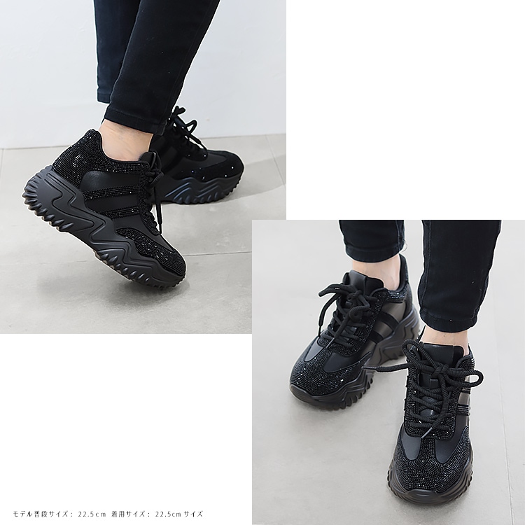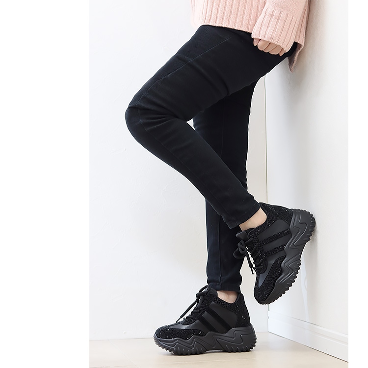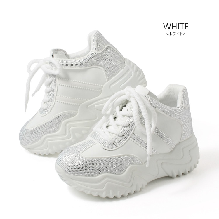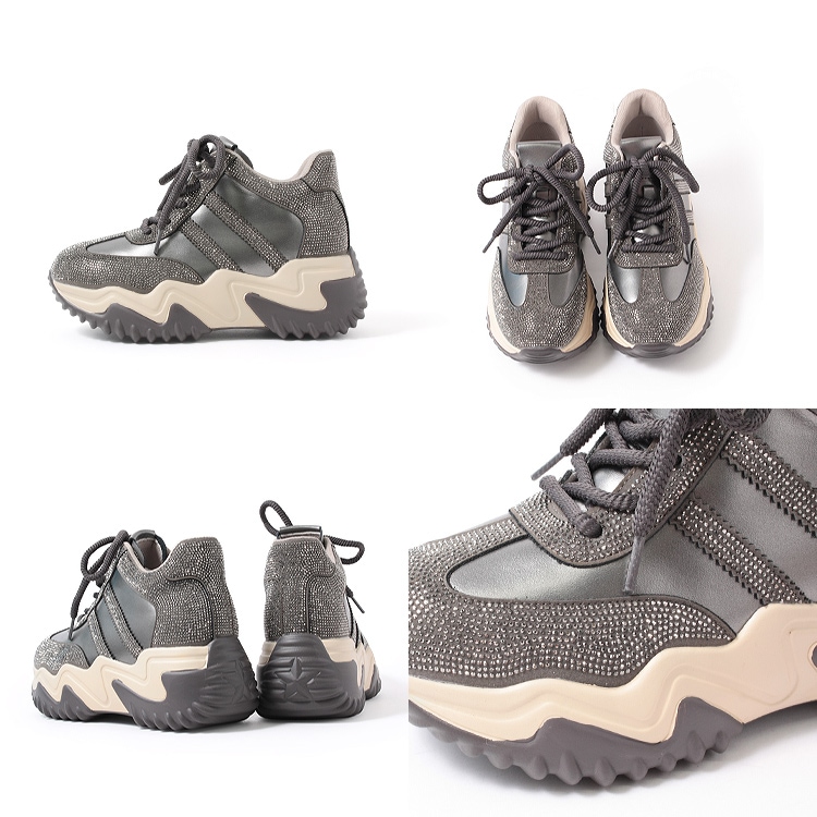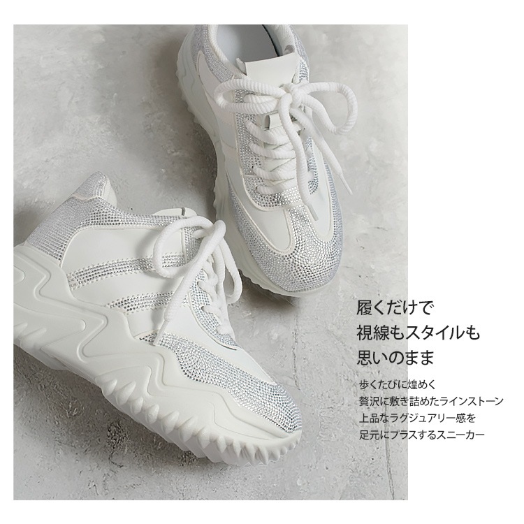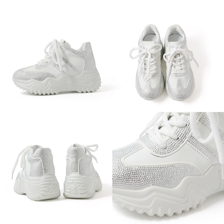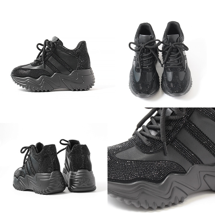 スニーカー キラキラ ラインストーン 撥水 レザー ヒール6cm レースアップ 厚底 ボリューム 2026新作ひも靴 1029