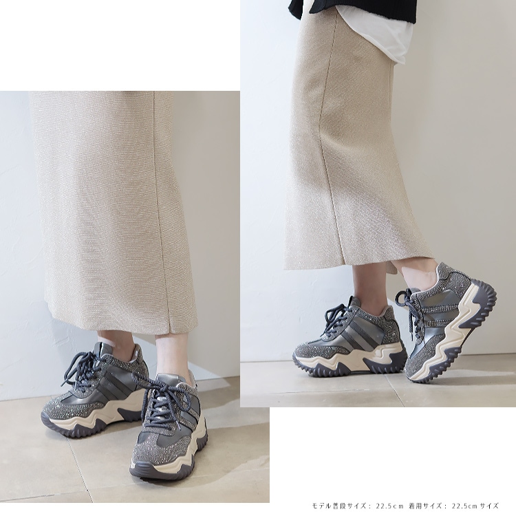 | コメント | 贅沢に敷き詰められた小粒なラインストーンがキラキラと煌めく厚底スニーカー。 旬なボリュームがありながらすっきりとした細見えシルエットに6cmのヒールで履くだけでスタイルアップが叶う1足。 本体素材には柔らかな撥水レザーを使用し、お手入れ簡単なところもうれしいポイント。 さらに軽量なアウトソールと取り外し可能な肉厚のクッションインソール入りで歩行をサポートしてくれるので、たくさん歩く日にもぴったりです。 大人っぽく同系色でまとめたカラーリングに存在感あるストーン使いデザインでスポーティかつラグジュアリーな足元を演出してくれるスニーカーです。 |