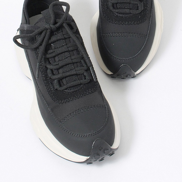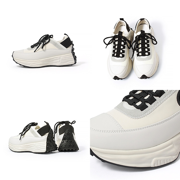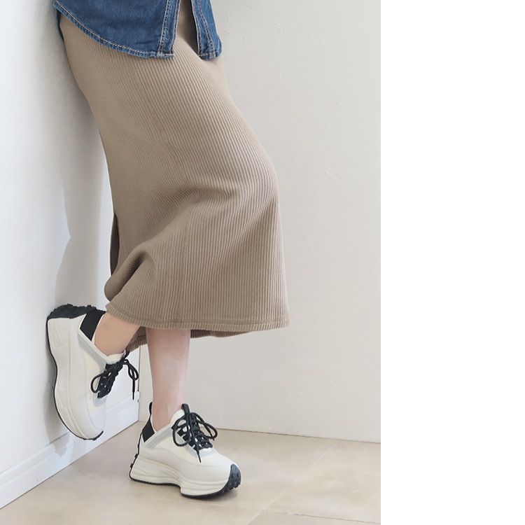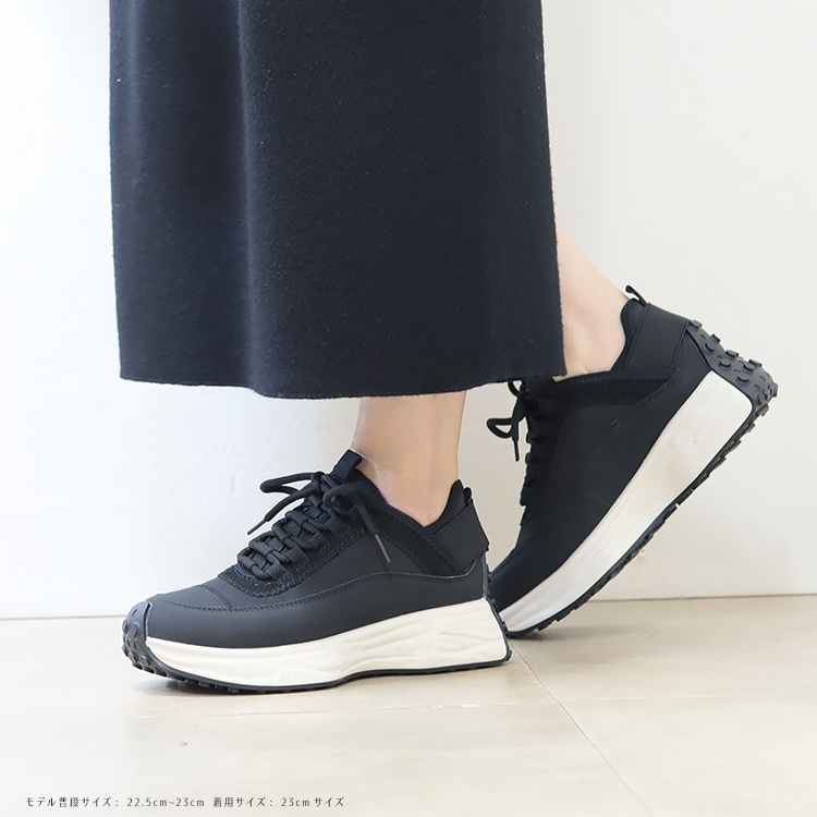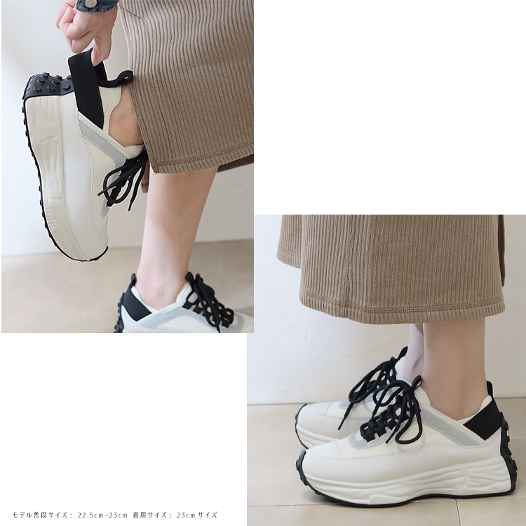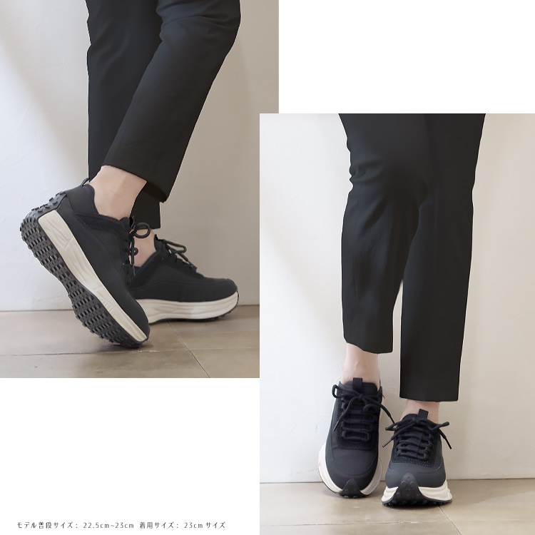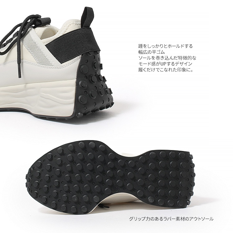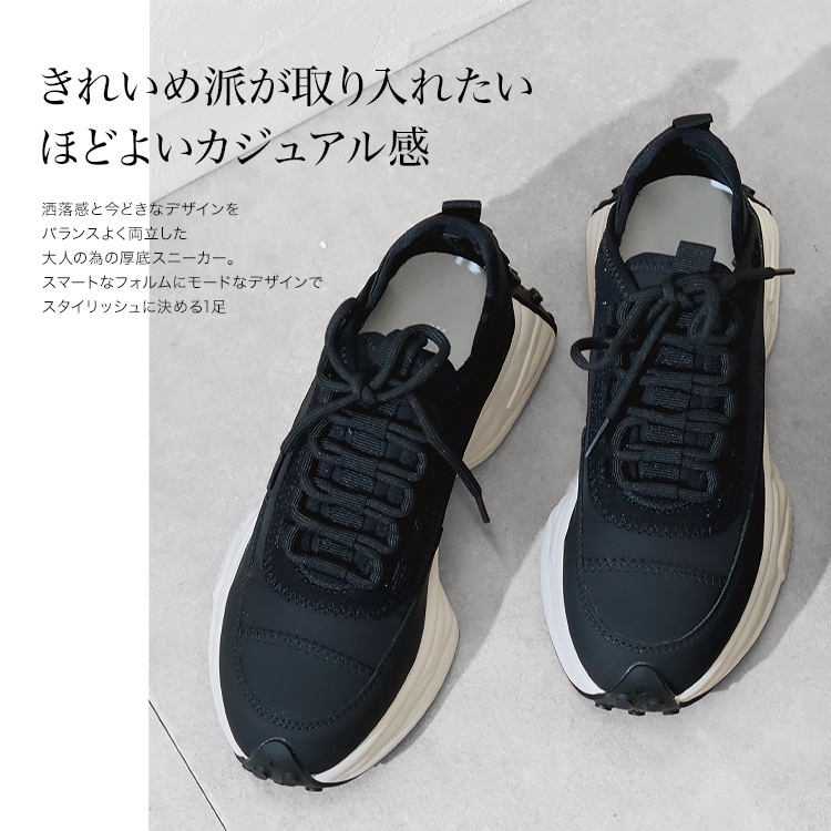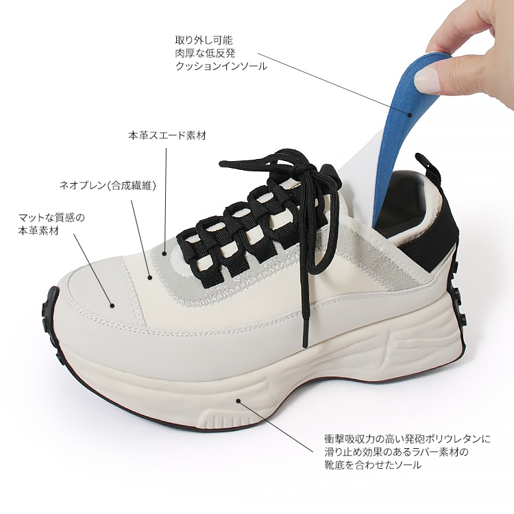 | コメント | 休日はもちろん通勤にも使えて、きれいめ感と今どきなデザインをバランスよく両立した大人のための厚底スニーカー。 厚底ながらスマートなフォルムと本革、スエード革、ネオプレン生地と3種の異素材を組み合わせたデザイン性でいつもの着こなしに抜け感とこなれた印象をプラスしてくれる1足です。 軽量な発砲ポリウレタンの厚底ソールは歩行に最適な弾力に調整、肉厚なクッションインソールも入り歩行時の衝撃を吸収し足への負担を軽減してくれます。 また、踵には幅広の平ゴムでホールド力とフィット感を実現。 アウトソールを巻き込んだ特徴的な仕様で機能性もありながらデザイン性もアピールするスタイリッシュなスニーカーは、お出かけ時のトレンドスタイルだけでなく、お仕事スーツに合わせてもおしゃれに決まるオススメスニーカーです。 |