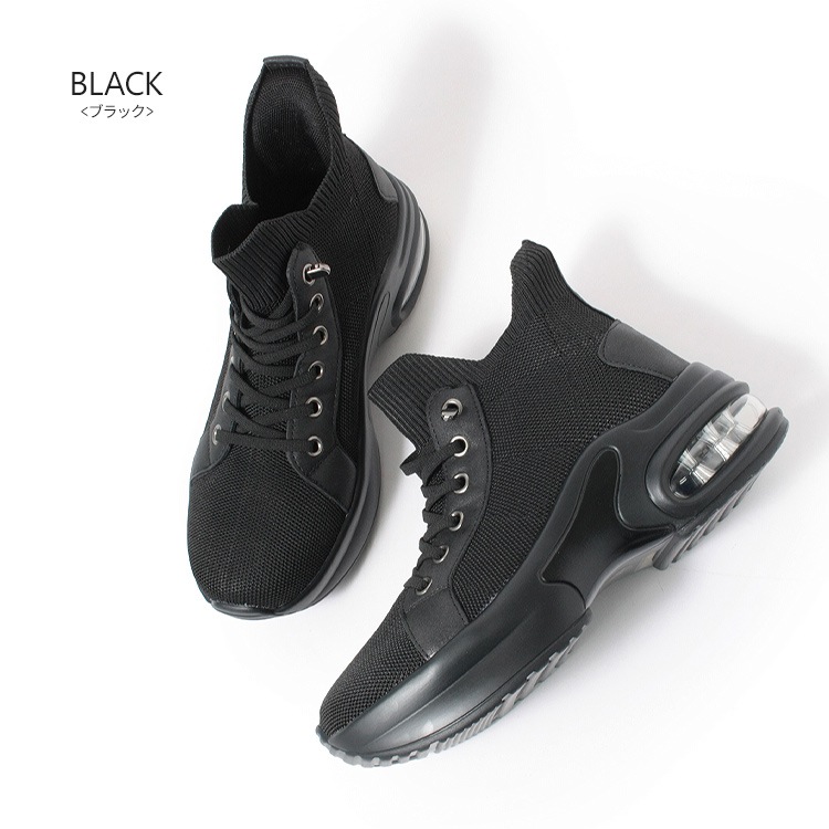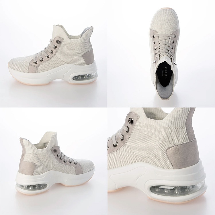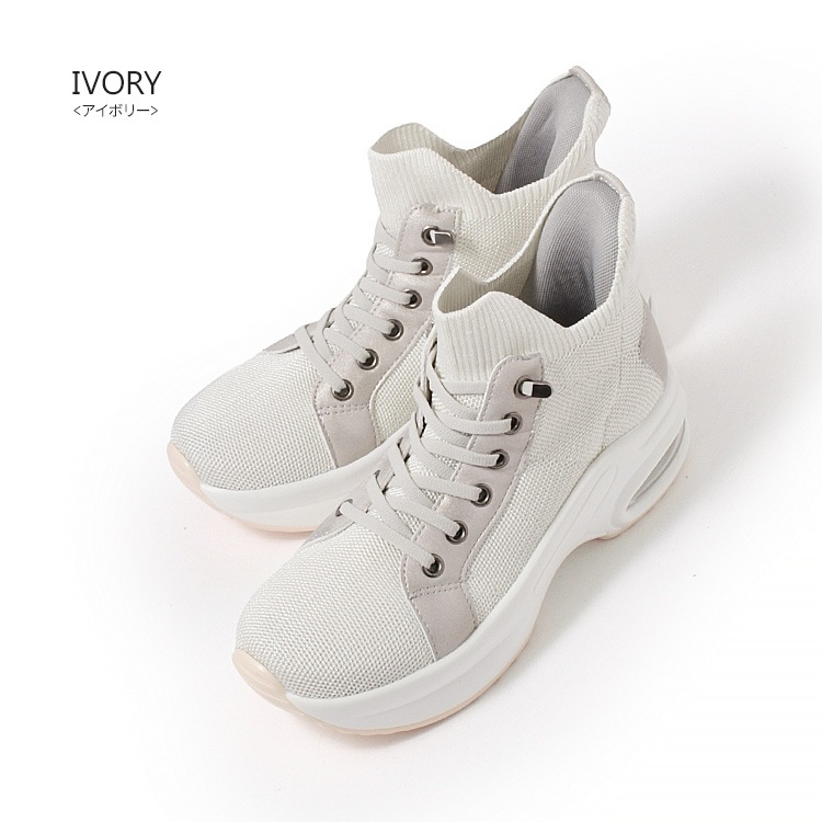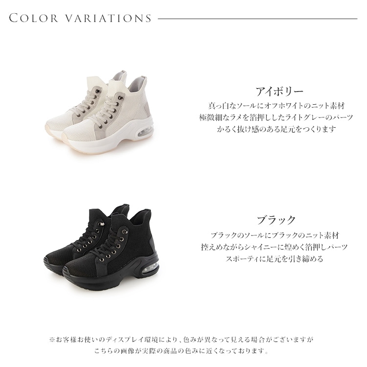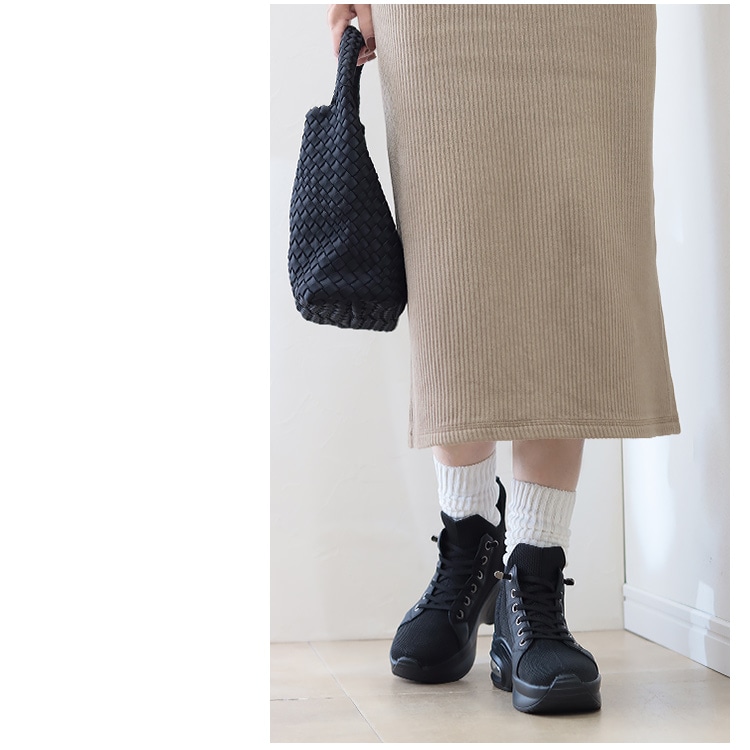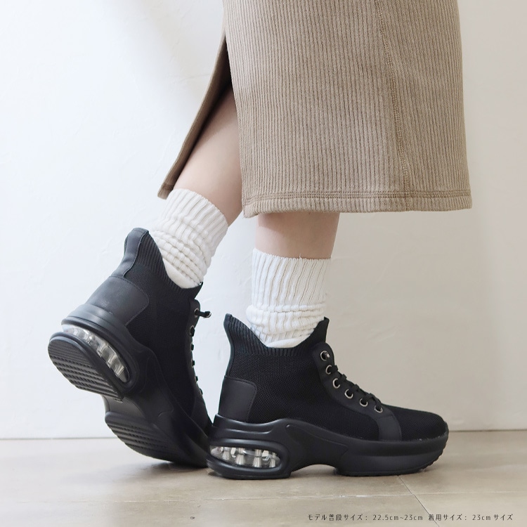 | コメント | 立ったまま手を使わなくても脱ぎ履きが出来るスリップインタイプのハイカットスニーカー。 立体成型で編み込まれたニット素材に撥水加工を施して、伸縮性と通気性を保ちながらの撥水性を実現し、汚れ軽減効果も期待できるうれしい機能! 踵部分はモールドパットが入り踵がつぶれることなく履けるハンズフリーでスムーズな足入れが可能。 靴ひもは伸縮性があり、解けないゴム仕様で着用時の煩わしさを無くしサッと履ける快適さがおすすめ スタイルアップ効果を発揮する6cmのヒールアップエアークッション入り厚底ソールで長時間の歩行も足への負担を軽減してくれます。 さらっとした手触りでシルクのような光沢が上質感をアピールするニット生地はカジュアルスタイルもきれいめに仕上がるポイントです。 |